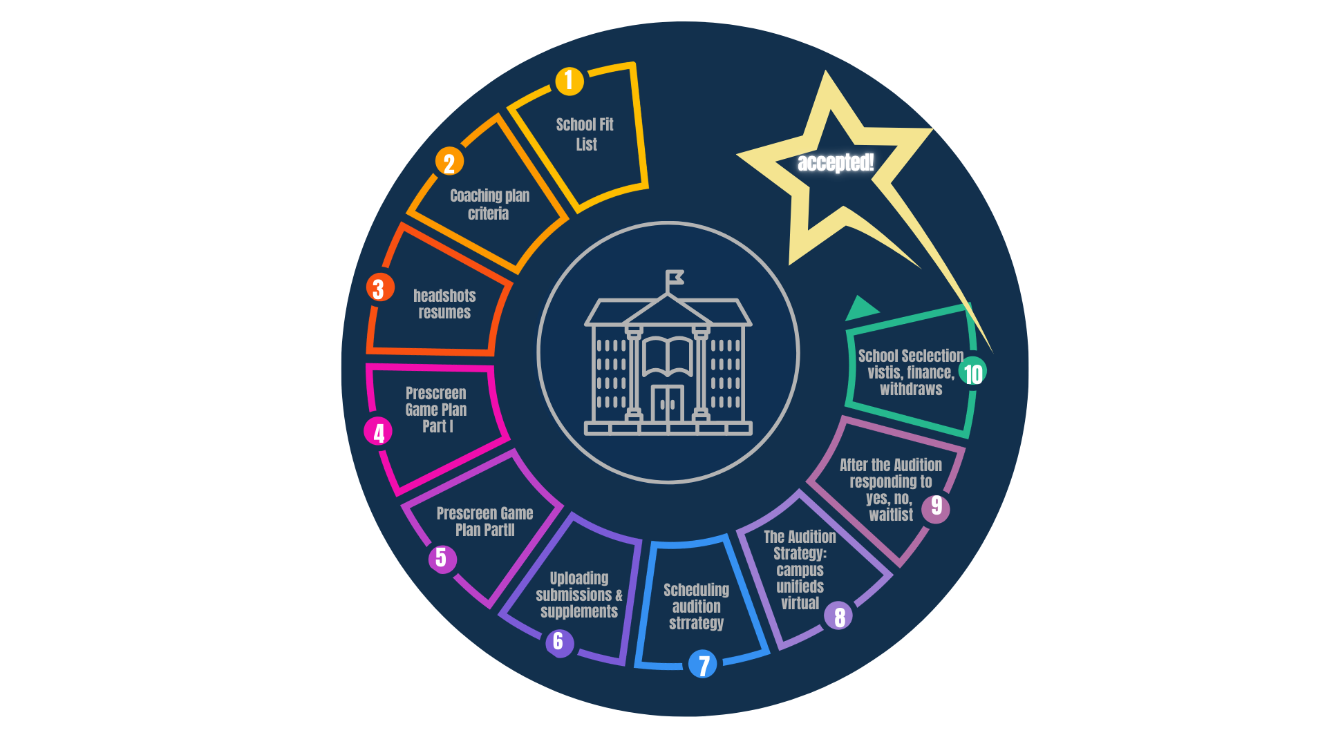 College Bound Students have landed programs at University of Michigan, Carnegie Mellon University, NYU Tisch, Syracuse University, Northwestern University, YALE, Penn State University, Boston Conservatory, Berkley School of Music, Elon University, Oberlin Conservatory & College, Rider University, Oklahoma University, Texas State University, UCLA, Texas Christian University, USC, Ithaca College, Emerson College, Marymount Manhattan College, Manhattan School of Music and many, many more. Each students journey is unique and the goal is to tackle this extensive process honoring the individuality of each students so they can find that fit program and school where they can flourish. 〰️